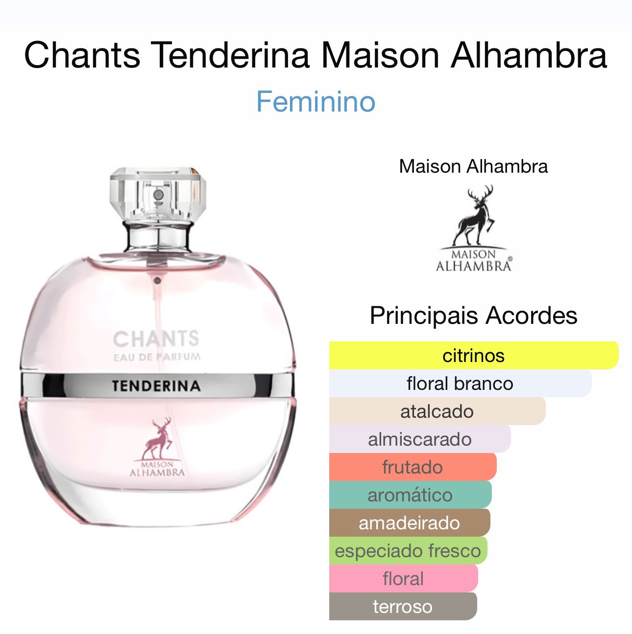 Chants Tenderina de Maison Alhambra é um perfume Floral Frutado Feminino. Chants Tenderina foi lançada em 2022. As notas de topo são: Bergamota, Flor de Toranja e Pêssego. As notas de coração são: Jasmim, Rosa e Íris. As notas de fundo são: Almíscar Branco, Vetiver, Baunilha e Patchouli.